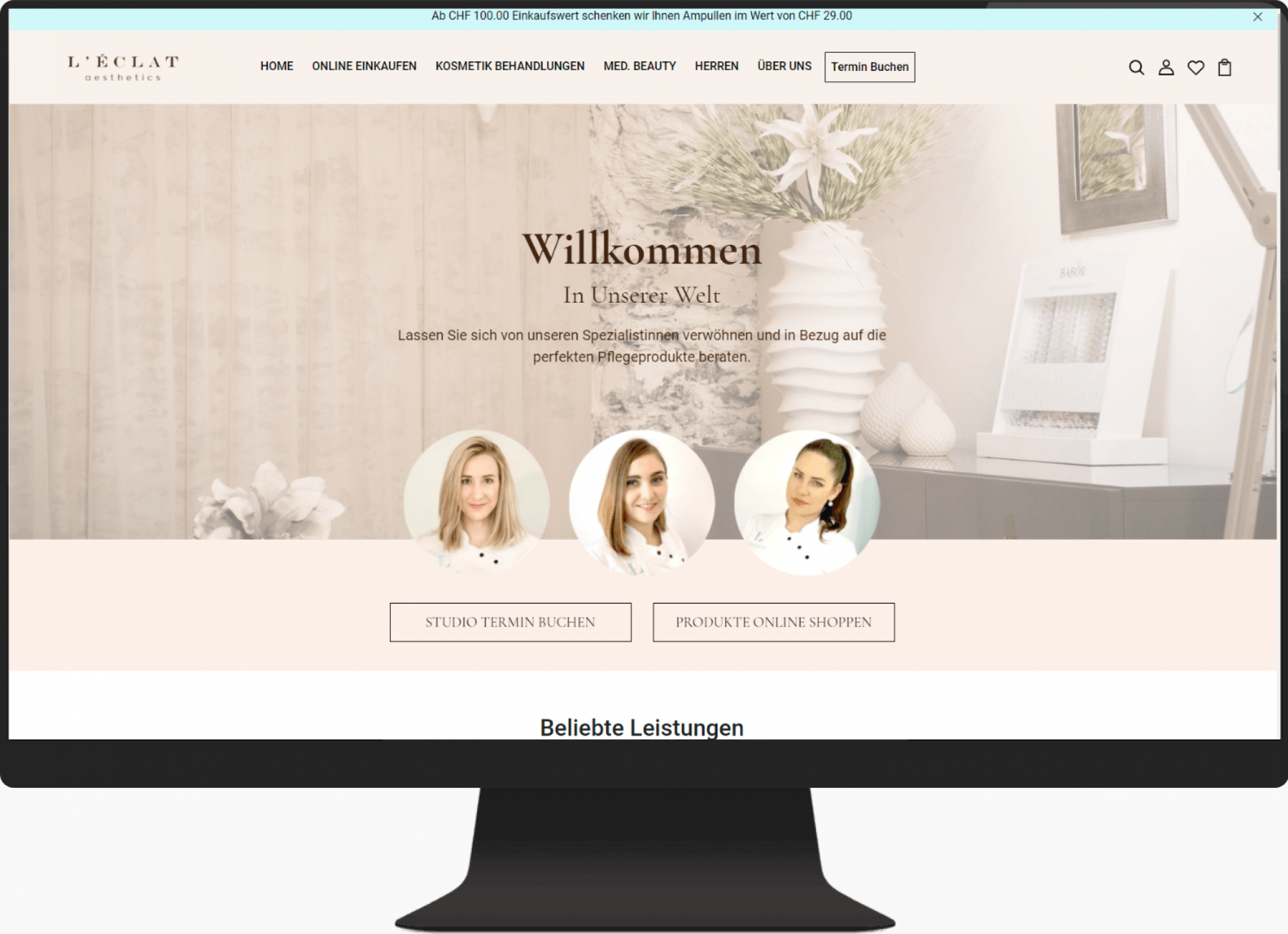 Erstellung eines Mobile-First Onlineshops für das Kosmetikstudio L’Eclat mit klarem Aufbau, Kategorisierung und intuitiver Nutzerführung für Dienstleistungen und Produkte.